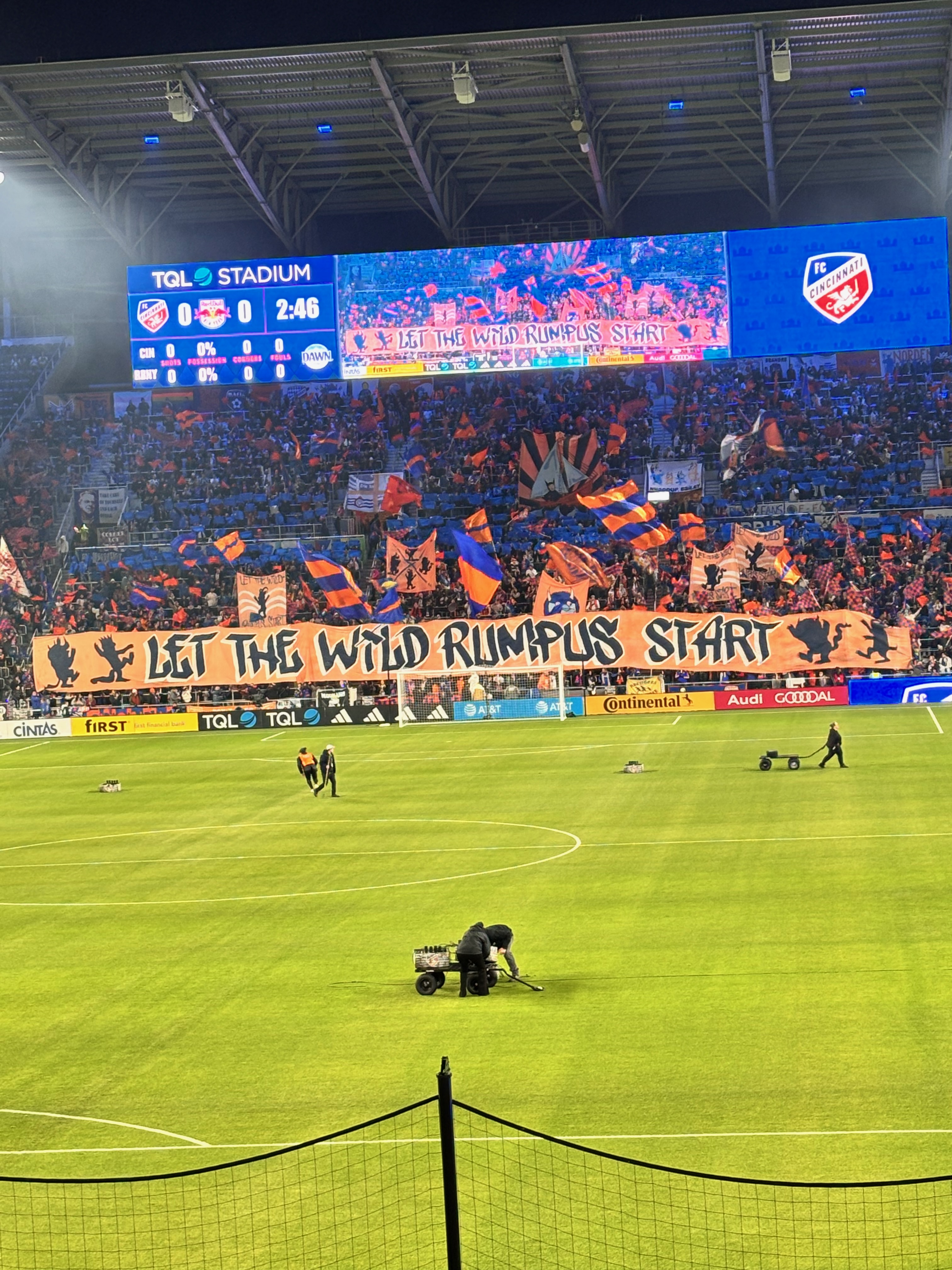 #The Game Itself I was lucky enough to attend this game and before the game even began, the atmosphere was amazing. At the time of kickoff, the temperature was a cold 30-ish degrees but this did not tamper the fans, especially in the Bailey, even for a moment. The night began with an amazing firework display, where one of the techs even took a firework to the face (whom I hope is okay), and a nice tifo from the Bailey that read “Let the wild rumpus start”.