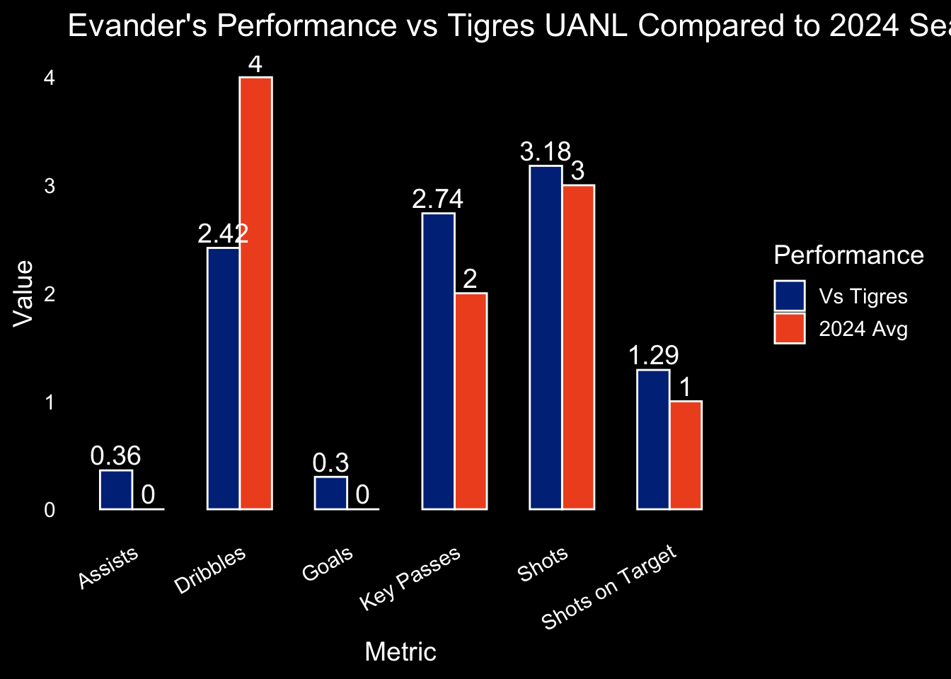 The rest of the game was cagey, with good chances from Evander on the edge of the box around the 60th minute and from Orellano, who finally returned to the squad with a solid 30-minute stint in the second half. Sadly, the game ended in a 1-1 draw, and Cincy will head into next week’s fixture in San Nicolás, Mexico. #Thoughts + a bit of midfield analysis First, here’s a graph to show the midfield breakdown for Evander vs Tigres.